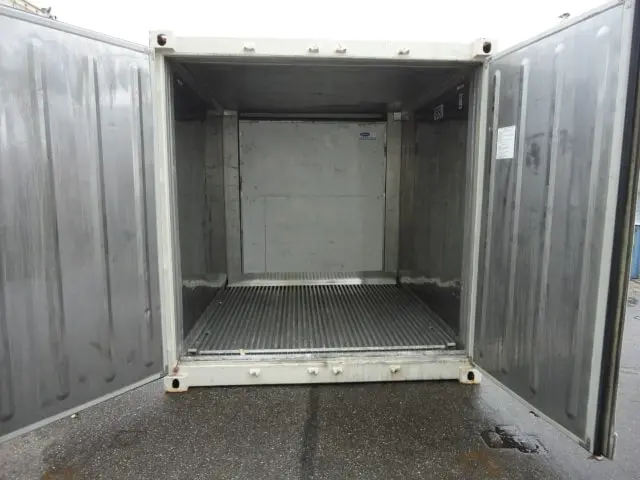 Il container frigorifero da 10 piedi è un piccolo container refrigerato lungo 3 m, equipaggiato con macchinari Carrier o Thermoking. Sia per lo stoccaggio che per il trasporto di merci deperibili, il container frigorifero da 10 piedi (o reefer) mantiene i vostri prodotti freschi. Dispone di controllo della temperatura tra -22°C e +22°C ed è alimentato a 380V. La sua struttura esterna in acciaio e l’interno completamente in acciaio inox garantiscono una pulizia rapida e semplice. Essendo lungo solo 3 m, occupa pochissimo spazio.