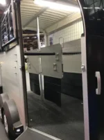 L’interno del van è studiato per offrire il massimo comfort ai cavalli. Le porte anteriori vetrate permettono una buona ventilazione naturale e illuminano l’interno. Le finestre laterali scorrevoli offrono visibilità aggiuntiva e possono essere aperte per migliorare la circolazione dell’aria. Le protezioni imbottite e le barre di sicurezza removibili assicurano una protezione ottimale durante il trasporto.